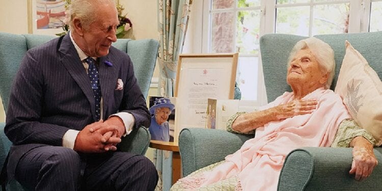 Carlos III visita a Ethel Catherham, la mujer más longeva del mundo, de 116 años.